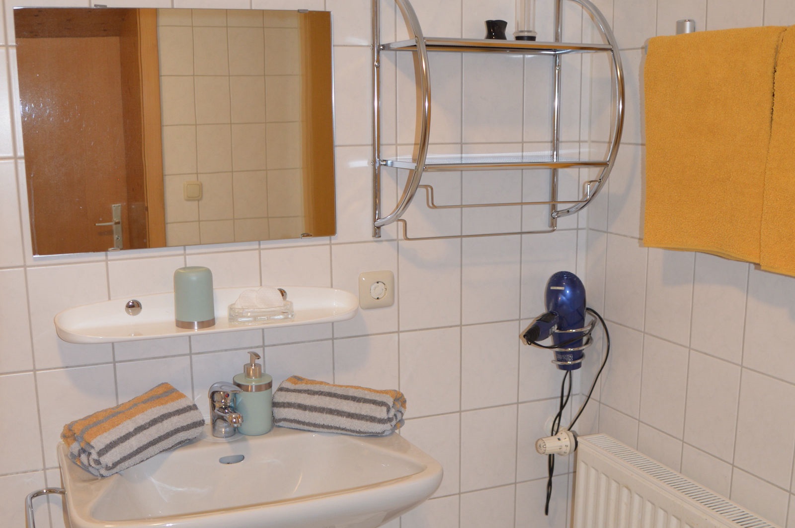 Sanitär: Dusche + WC, Fön, Handtücher, Badehandtücher und Kosmetikartikel.